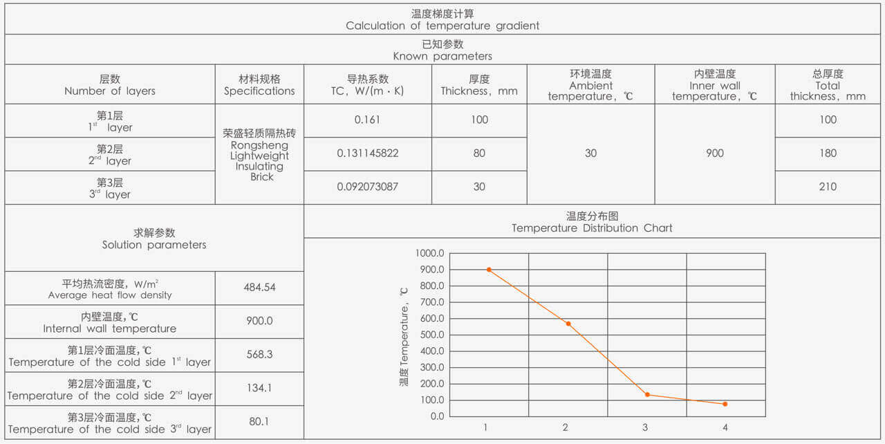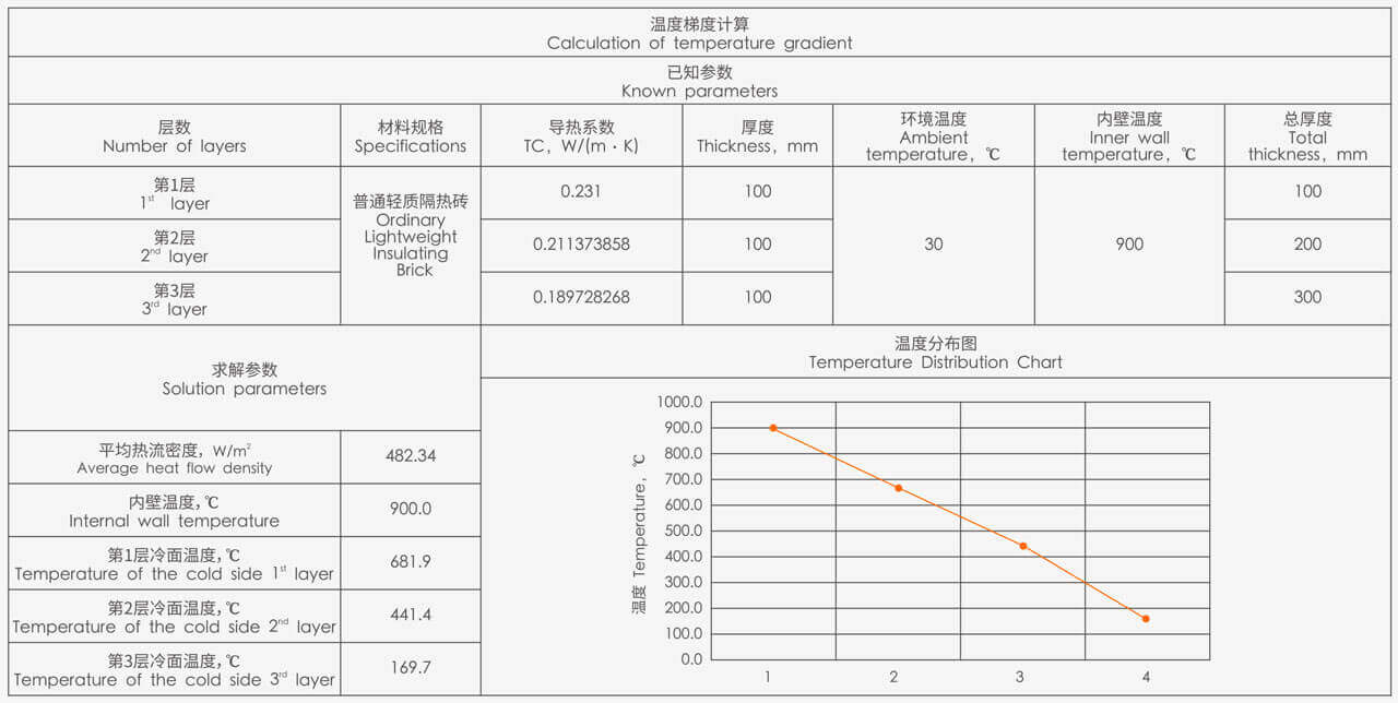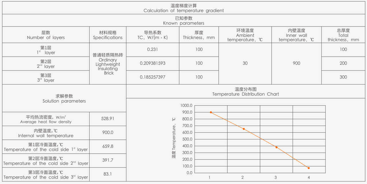 假定爐內溫度為900℃,外部環境溫度為30℃,無風條件下,采用1000型輕質隔熱磚,與市面上同價格輕質隔熱磚作為耐火隔熱層,對比同樣300mm厚度時的外壁溫度差異,以及達到相同外壁溫度80℃時墻體的厚度差異,詳細對比參數如下: