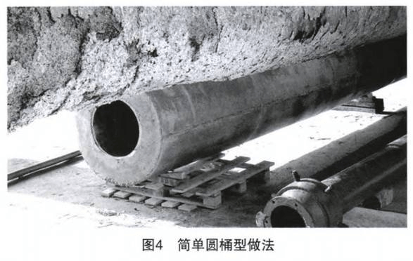 在回轉(zhuǎn)窯窯內(nèi)氣流中,煤粉燃燒器所產(chǎn)生的一次風外側易產(chǎn)生回旋渦流,氣流會帶動一些煤粉粘結在煤粉燃燒器頭部,產(chǎn)生結焦現(xiàn)象,隨著結焦逐漸增多、擴散,從而干涉火焰形狀,導致燃燒器兩側溫度不均。所以煤粉燃燒器不能簡單澆注成圓桶型,圖4為簡單圓桶型做法。而應澆注成倒角(建議30°~40°),倒角澆注方式能夠簡單有效地降低結焦現(xiàn)象見圖5。